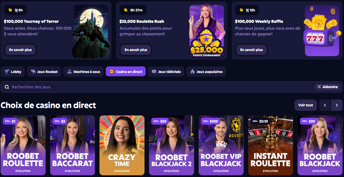 Les classiques ne manquent pas: blackjack, roulette, baccarat et poker. Ces jeux sont disponibles en versions RNG et en direct, avec des limites adaptées à tous les budgets sur Roo bet casino.Casino en direct