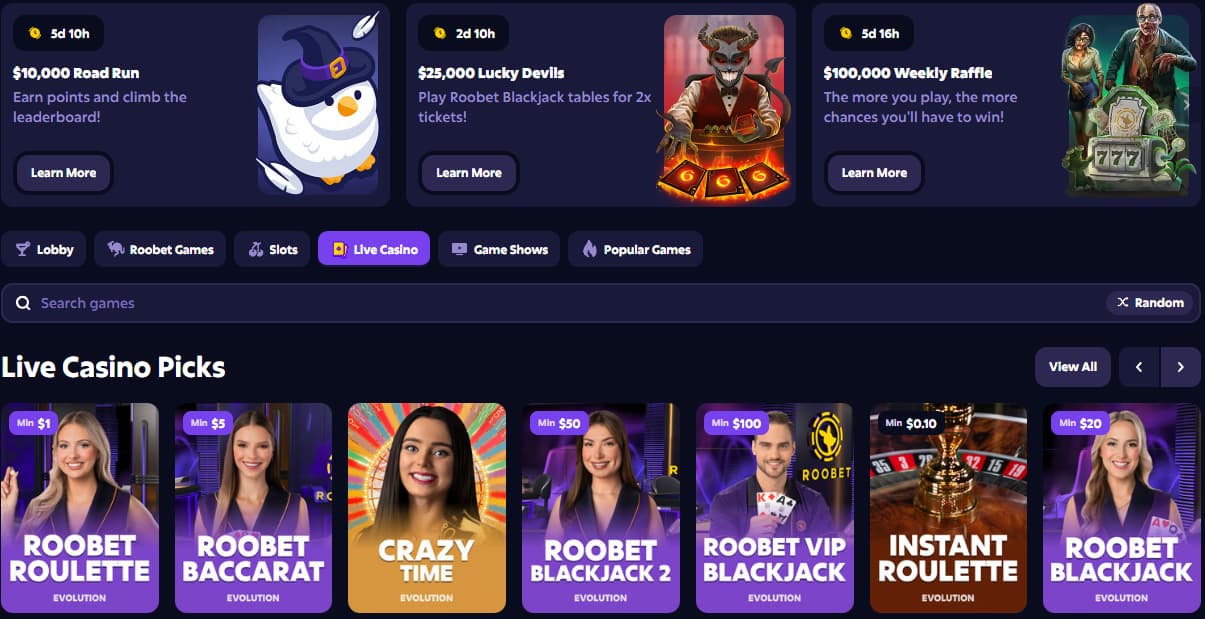 Roobet Casino Norge tilbyr et omfattende live casino drevet av Evolution og Pragmatic Live. Du kan chatte med ekte dealere mens du nyter HD-streamingkvalitet.